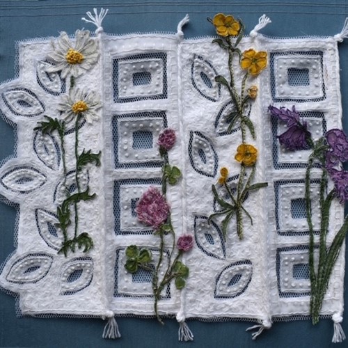 Lynn Atkinson’s embroideries are based on the natural environment with its endangered flora and fauna. She uses sheer vintage fabrics and lace as a background, with hand embroidered detail.