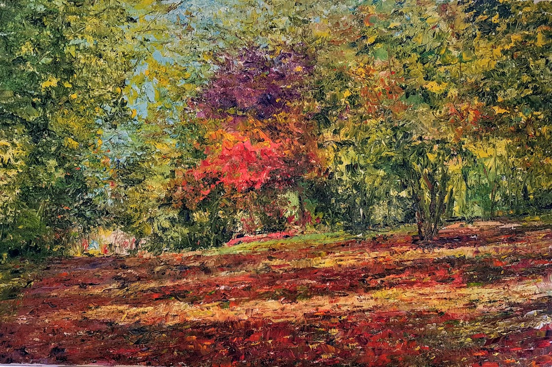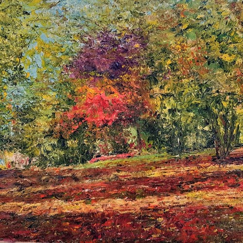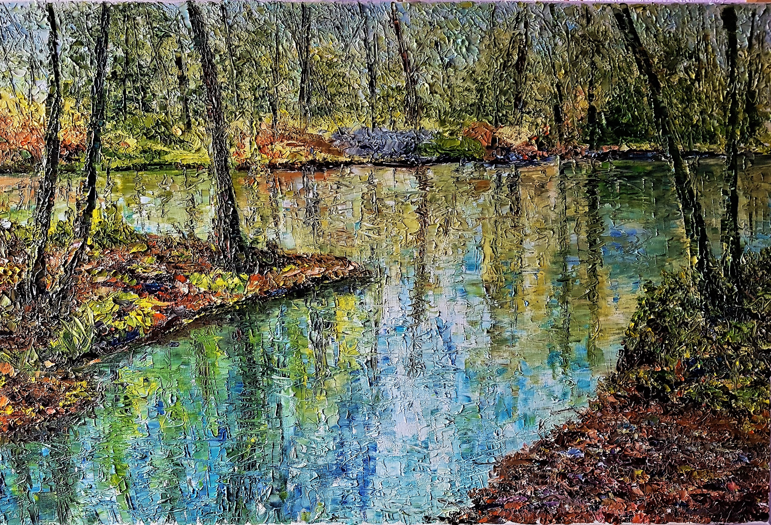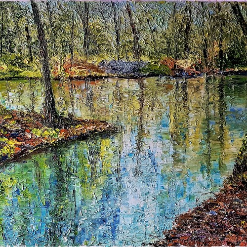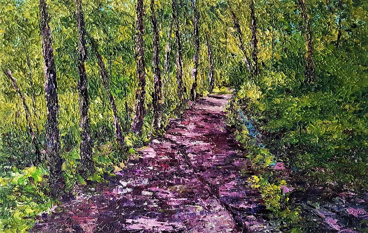 My landscapes are fragmented. As natural sunlight filters through the branches, the images highlighted are the colours and shapes of nature. I hope, using texture, I have captured the depth that can be found in woodland scenes.