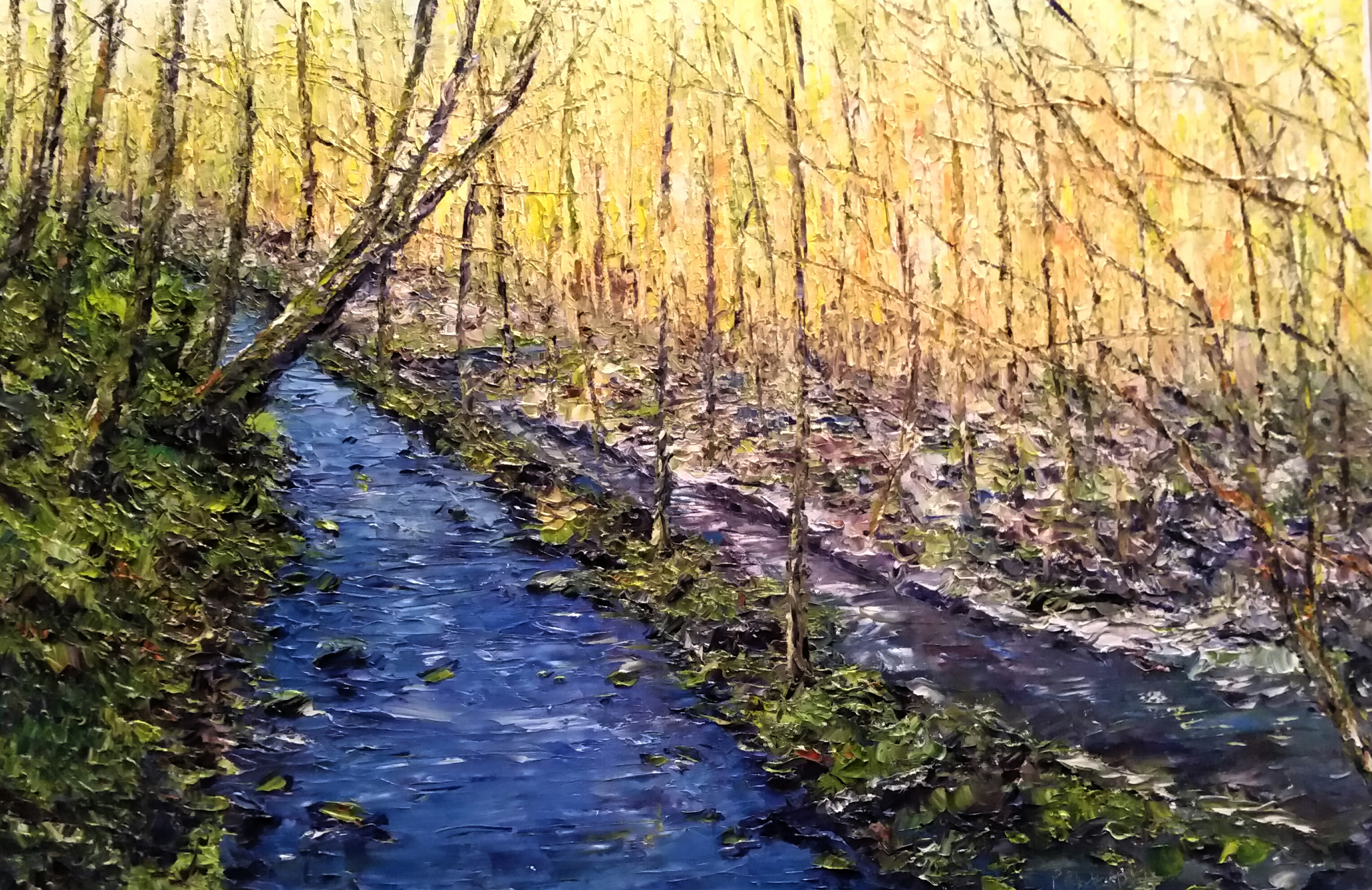 Here my paintings focus on the hidden view rather than large panoramas. These are painted initially in watercolour and then translated in larger oil paintings. Freedom and spontaneity are important to me and the use of a palette knife in these works allows me to capture both.