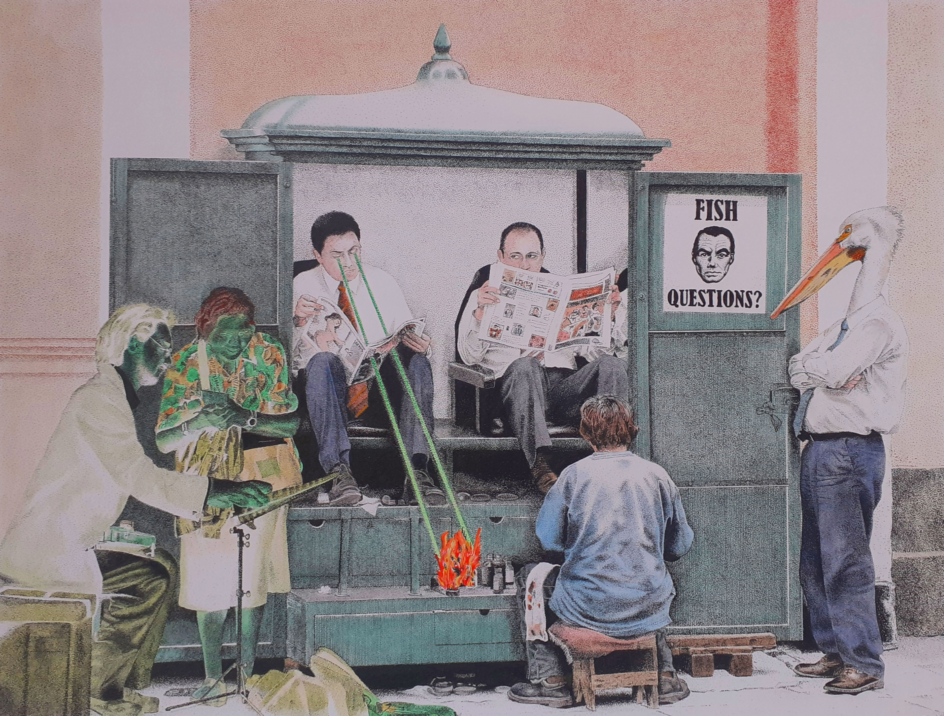 Howard Gardener is a locally based artist who uses technical pens to create elaborate monochrome ink drawings. These are then coloured with acrylic washes, a technique that sprang from an interest in hand-tinted photographs. He also works in ceramics, stained glass and other three-dimensional forms.
