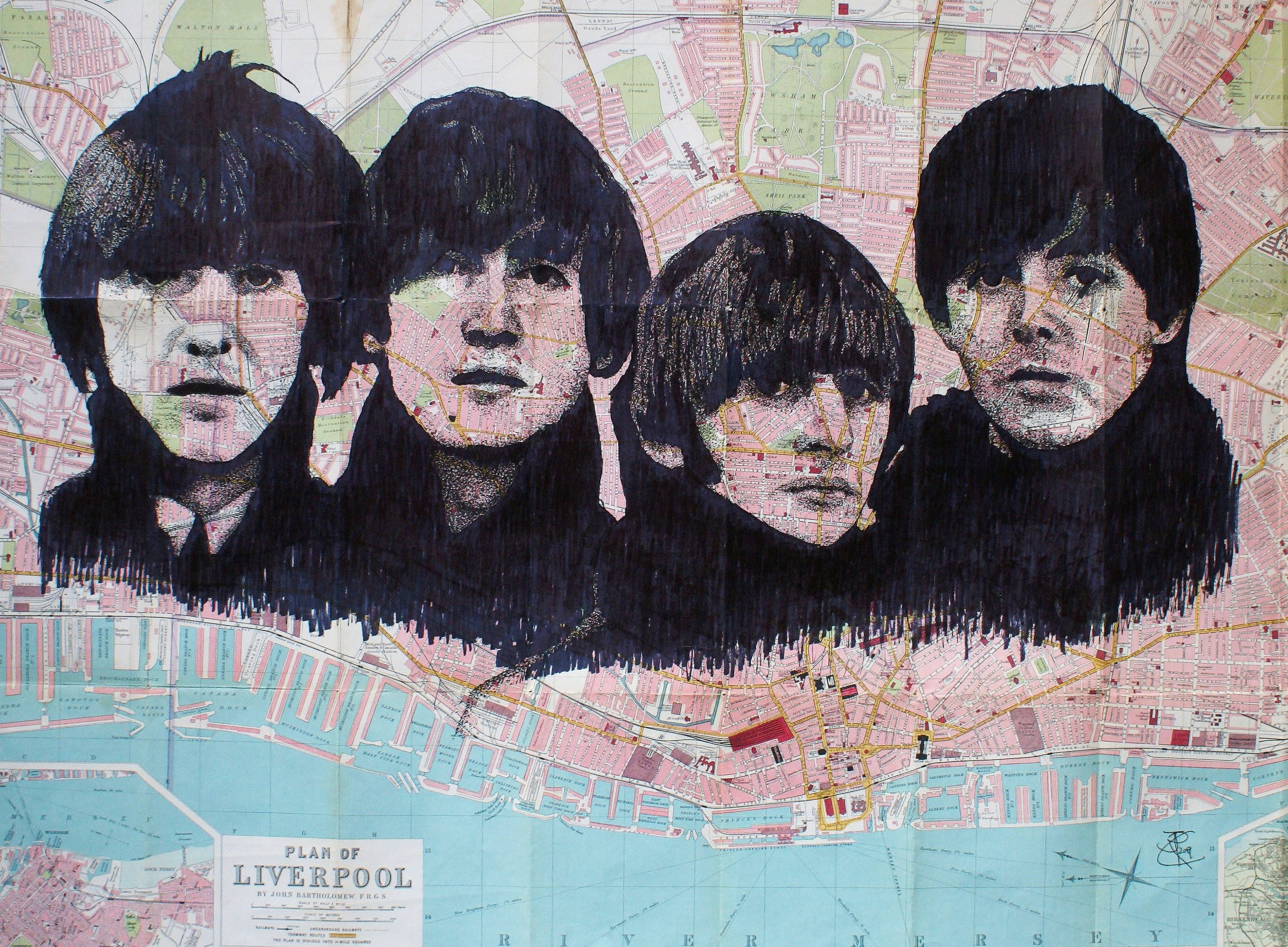 ….many of the drawings employ a stippling technique using numerous small dots, while some works incorporate song lyrics, providing depth and tone to the montage of images; processes that can take up to weeks or months to complete - a satisfying pastime that became a passion bordering on obsession….