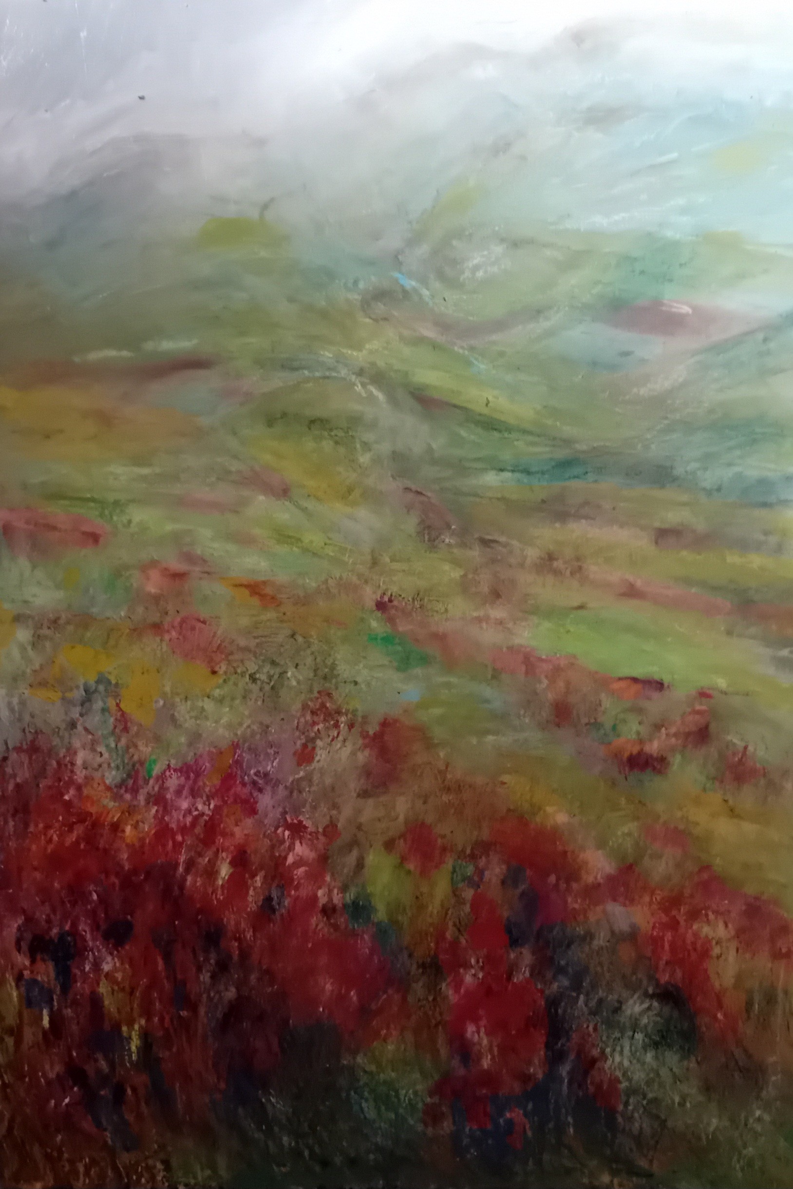 It rained all the way into the hills. Not kind to artists . Suddenly it stopped and we grabbed a few moments to get something down. But then it came again. Cold too. We held our paper down and covered up our beginnings. Our meagre marks.